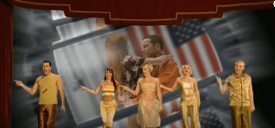 The band dance in front of a screen that plays clips of different films that the members are re-enacting. Famous films being acted out include Titanic, There’s Something About Mary and Austin Powers.