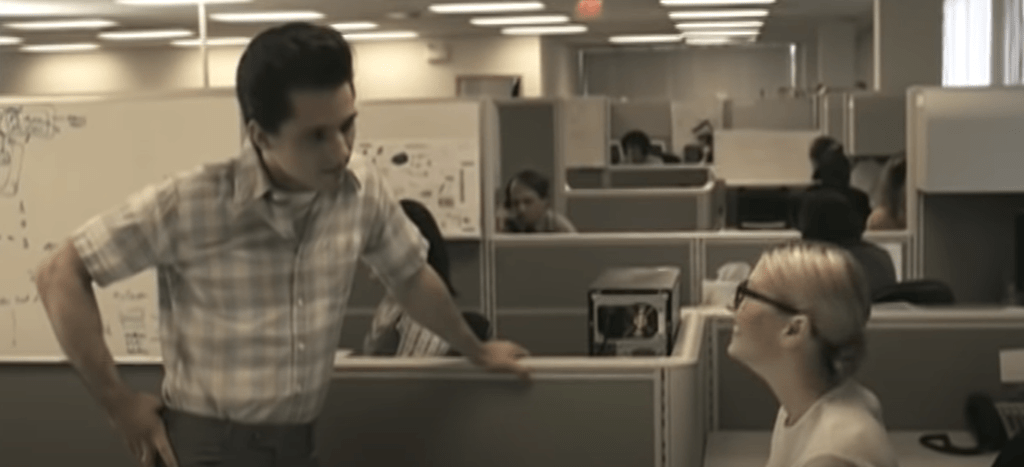 This image above is when the style starts to change and the guy and girl character decide to dress with how they feel comfortable and rebel against the boss and run to each other. It may be a subtle change in the colour code of the dress attire but there is hints of red which connote passion and the styles are emphasized to be different to stand out as to who they actually are as people. The camera styles and editing slightly change as well which make it really interesting to watch.