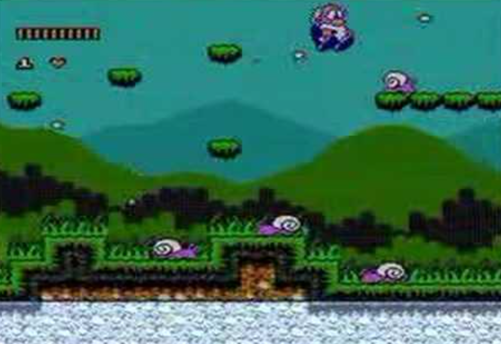 Just like many of the SNES games, this was also a side scrolling platform game where the aim was to get to the end of the level to save the animals before the water drowns you. The game was easy to control and you would use the buttons to both jump and fire ammo at the villains such as crabs, snails and worms. Each level also had a bonus round where you could collect more silver squares, which to me always looked like miniature televisions. At the end of each level, there was an evil plug ( which i always thought looked like an angry kite), that you would have to shoot many times to kill. Once the plug creature was dead the water would fall and there would be lots of fruit and vegetables falling from the sky