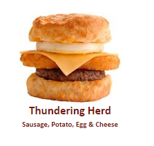 One of the items that you are available to purchase is called the Thundering Herd – there are many different varieties but I chose to speak about this one because I thought the name was quite striking. This particular biscuit is a layer of flat sausage then topped with a hash brown, cheese and then finished off with an egg on top.