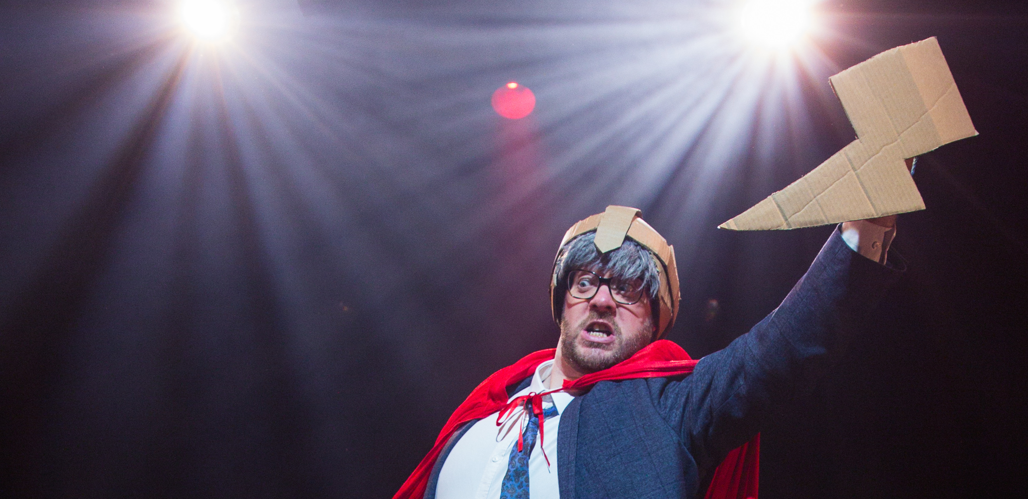 Our show is anarchic, we take suggestions that inspire us to create three new myths. In the final story a member of the audience becomes the hero of the quest. All our props are created out of cardboard – so we literally recycle everything.