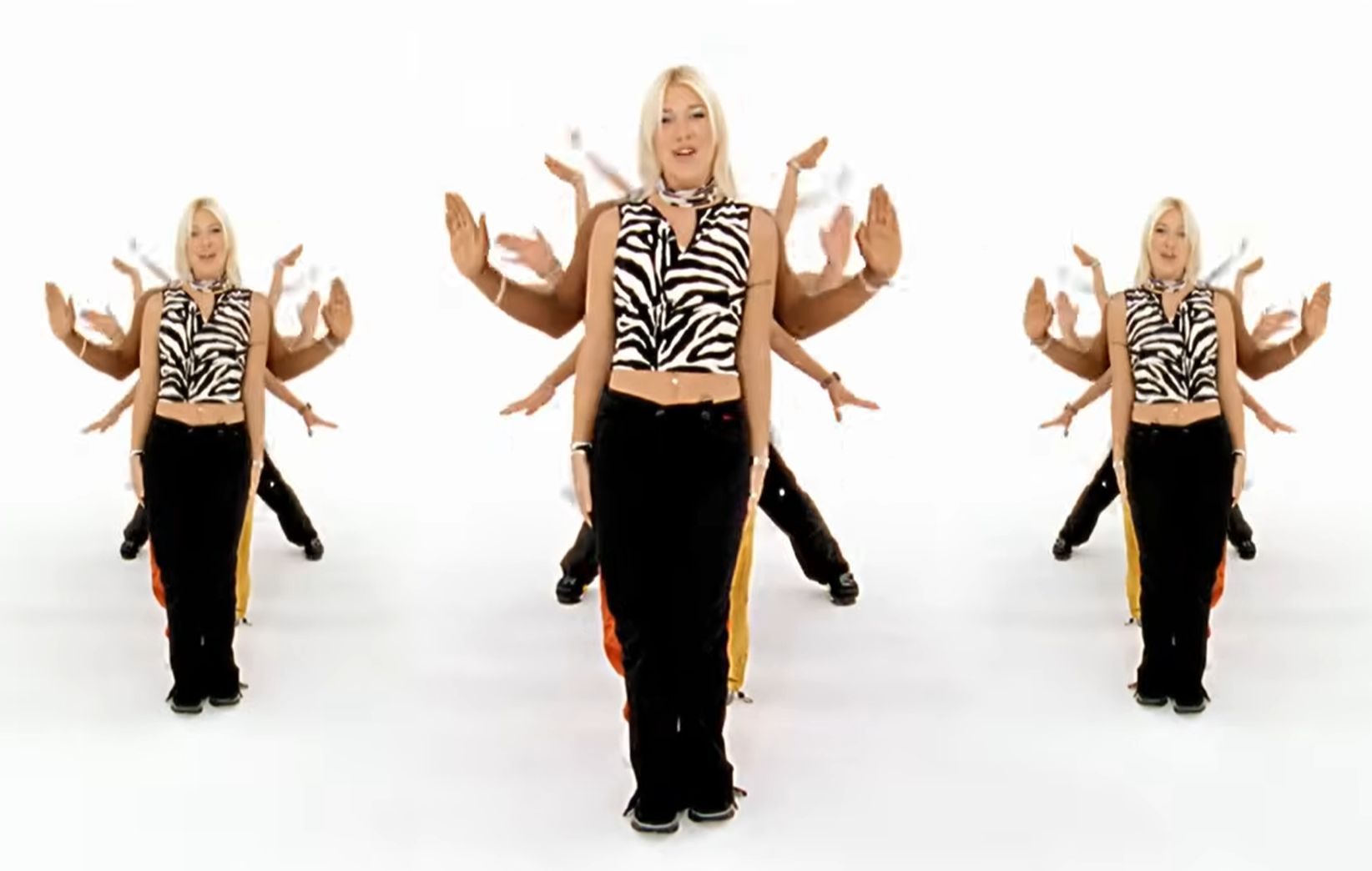 There is only one part that has a different style of editing and that is right at the beginning when the first verse starts. When the band are in a dance line queue thing, there is an edit technique where you see three different versions of the band pop up. It goes in time to the beat and creates an element of fun to the video again.