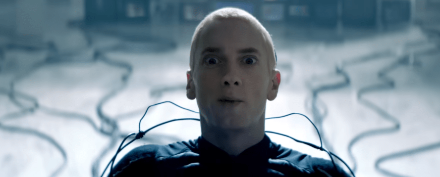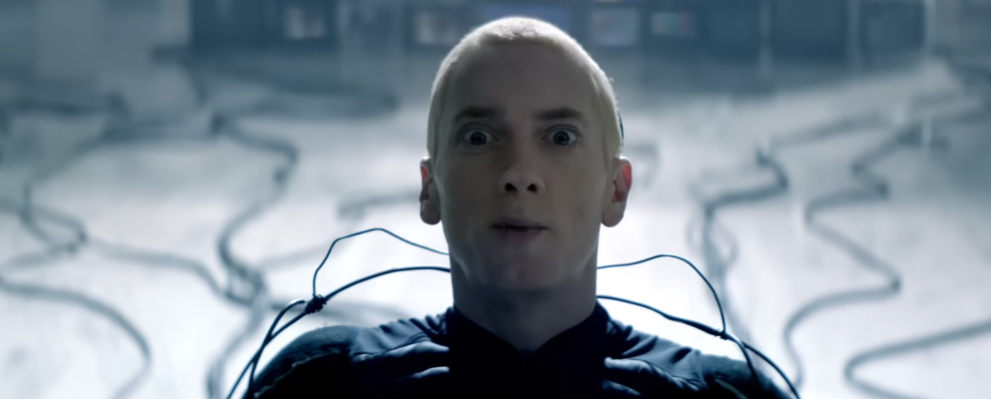 Eminem is plugged up to a computer machine and they are trying to put as many words as possible into his brain until the computer overloads.